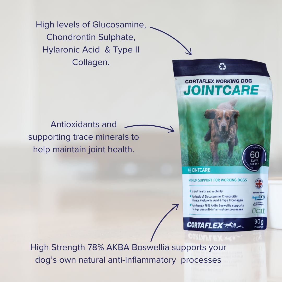 Canine Cortaflex Working Dog Jointcare provides the highest strength, natural ingredients to support joint health and mobility in hard-working or very active dogs, and those of advancing years. Scientifically researched and containing elevated levels of key compounds such as glucosamine, chondroitin and hyaluronic acid, as well as collagen. Antioxidants and a highly concentrated Boswellia extract support the dog’s own natural anti-inflammatory processes, to ensure dogs can maintain their active lifestyle in comfort!